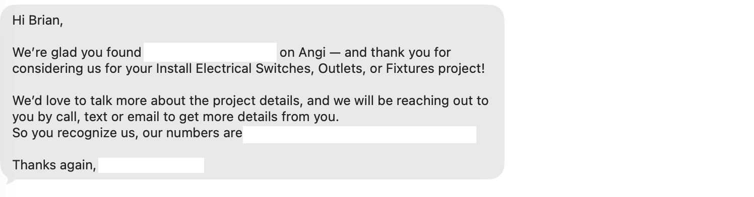 Angi is very effective at rapidly matching customers with local contractors. Arguably, almost too effective - within seconds of submitting my request, my phone lit up with five different texts. Parsing through this mini-avalanche of help can be a bit overwhelming.