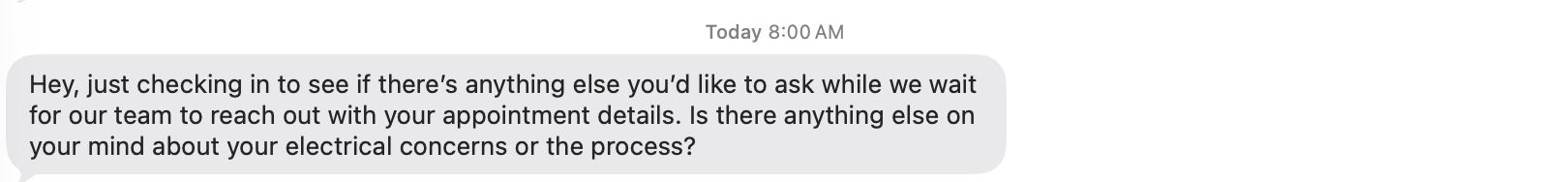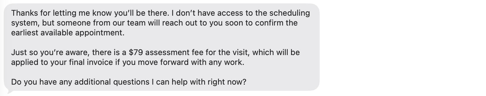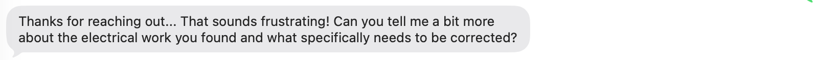 What followed were a series of text messages with Tim that ran me through a standard service on-boarding script (name, address, type of home, description of the problem, etc.). Chat systems have been capable of this for a while now, but the detailed, contextual answers were noticeably more refined.