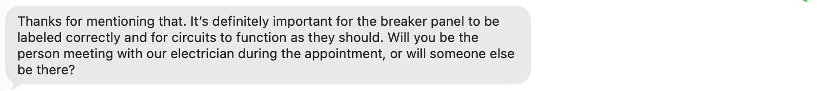 When I mentioned a detail about my electrical panel, Tim referenced it in a way that was coherent and technically plausible. Impressive. Not exactly trade school-level detail here, but still pretty solid.